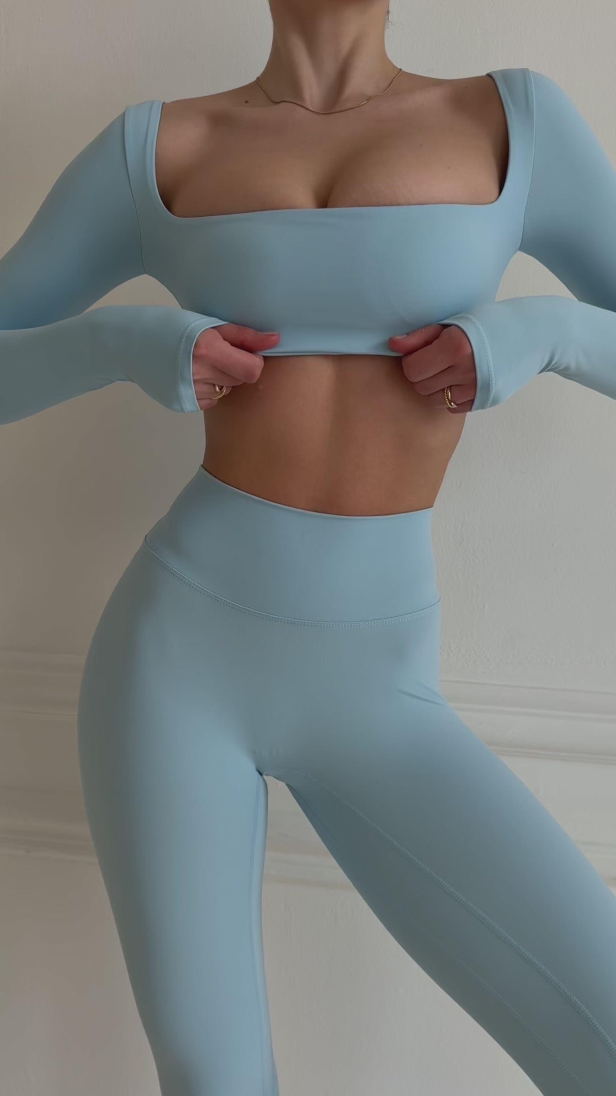 Minimalist edge with a sculpted finish. This long-sleeve crop top features a square neckline, body-contouring fit, and full-length sleeves for sleek coverage. Made from smooth, stretchy fabric that moves with you—perfect for layering or wearing solo from studio to street.