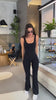 Turn heads in this sleek and sculpting Cut-Out Flared Jumpsuit. Designed to flatter every curve, it features an open back and V-cut waist that enhance your natural silhouette, while the scrunch seam detail lifts and shapes the glutes. The flared leg adds a retro-chic touch, perfect for styling from studio to street. Made from a smooth, stretchy fabric for maximum comfort and flexibility.