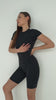 Prepare to dive into the athleisure trend with the contour seam open-back short-sleeve Jumpsuit, a piece that seamlessly blends style and practicality. The expertly placed contouring seams sculpt and shape your figure, providing a flattering fit that enhances your natural curves. The classic crew neckline and raglan short sleeves balance the bold open-back design, which adds a touch of daring sophistication. With its subtle back closure, this Jumpsuit ensures a secure fit while keeping the look clean and smooth. Falling to a mid-thigh length, our jumpsuit is tailored to highlight your legs while maintaining a sleek, minimalist aesthetic. Its figure-hugging, streamlined silhouette complements your body from every angle. Crafted from soft, stretchy fabric, it adapts to your movements, guaranteeing ultimate comfort and flexibility whether you're running errands, hitting the gym, or enjoying a laid-back day at home.