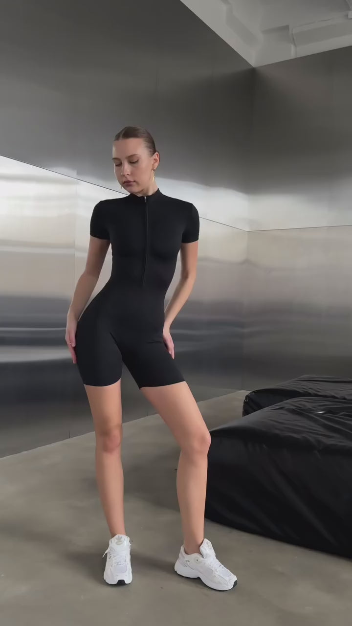 Sleek, sporty, and effortlessly stylish—the Short-Sleeve Zip Romper is your go-to one-piece for movement and confidence. Designed with a high neckline and front zip closure, it offers customizable coverage while enhancing your curves with a sculpting fit. The short sleeves and mid-thigh length strike the perfect balance between coverage and breathability, making it ideal for workouts, lounging, or layering up for a street-ready look.