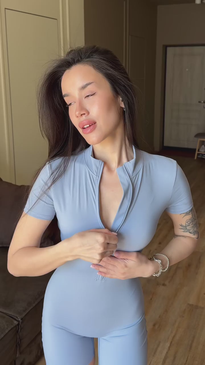 Sleek, sporty, and effortlessly stylish—the Short-Sleeve Zip Romper is your go-to one-piece for movement and confidence. Designed with a high neckline and front zip closure, it offers customizable coverage while enhancing your curves with a sculpting fit. The short sleeves and mid-thigh length strike the perfect balance between coverage and breathability, making it ideal for workouts, lounging, or layering up for a street-ready look.